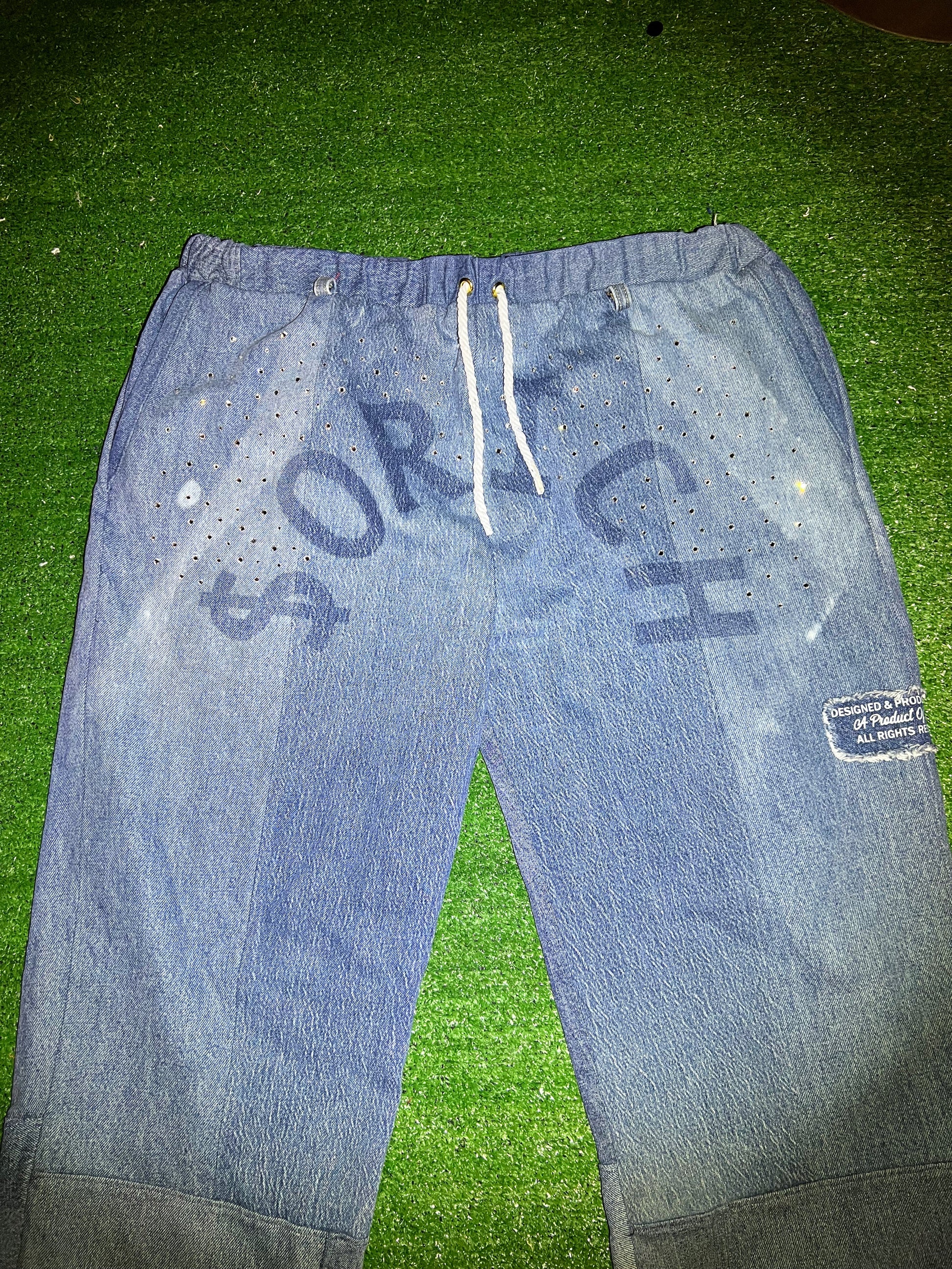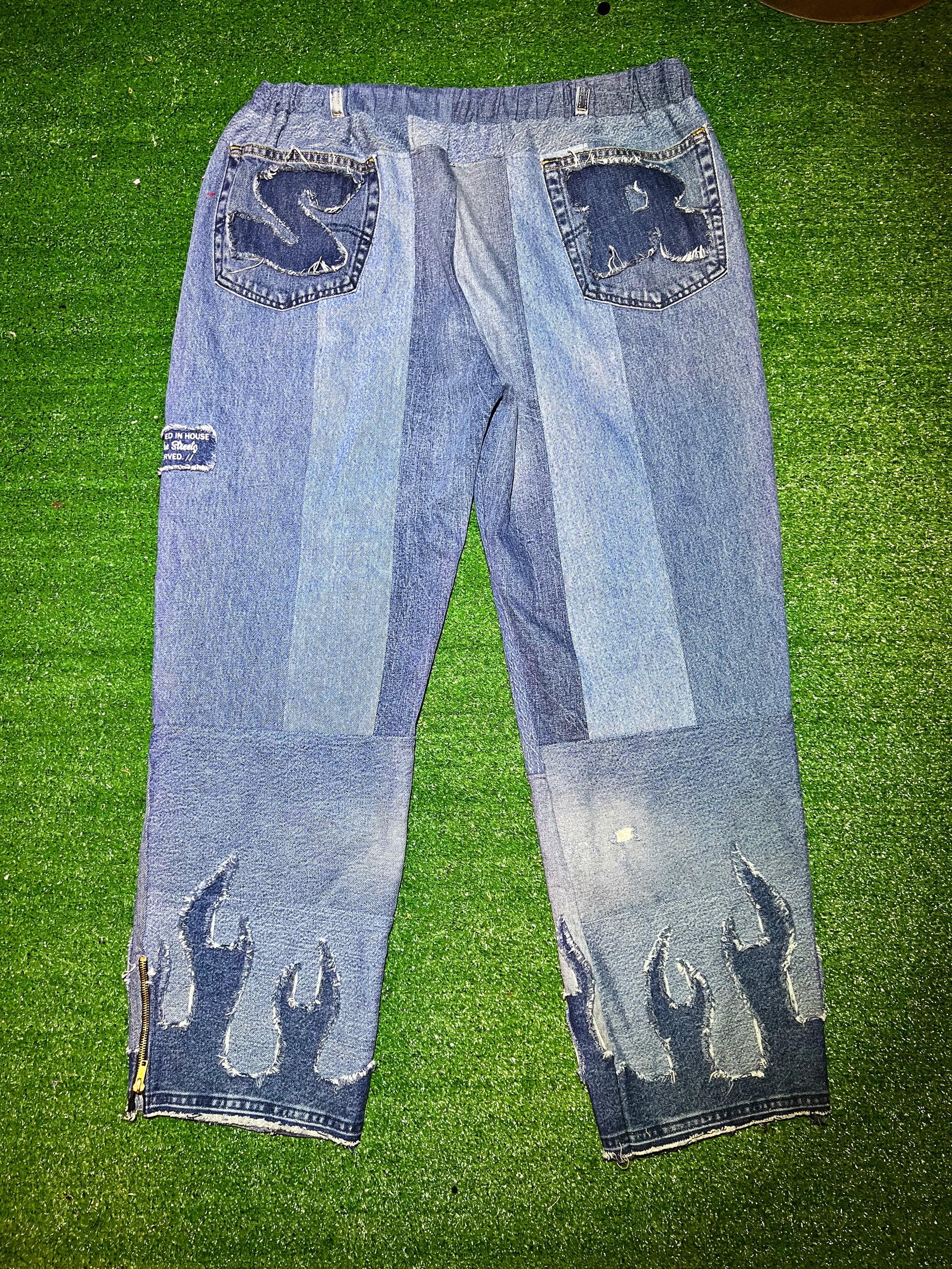 "Bright Night" Introduces A Pair of custom Heavyweight Oversized baggy jean pants assembled out of upcycled high quality denim pieces w/Washed Logo across the crotch along with chain loops, hand placed Swarovski crystals, 6 Pocket Panel Set up, ankle zippers & distressed denim flames that wrap around both legs.