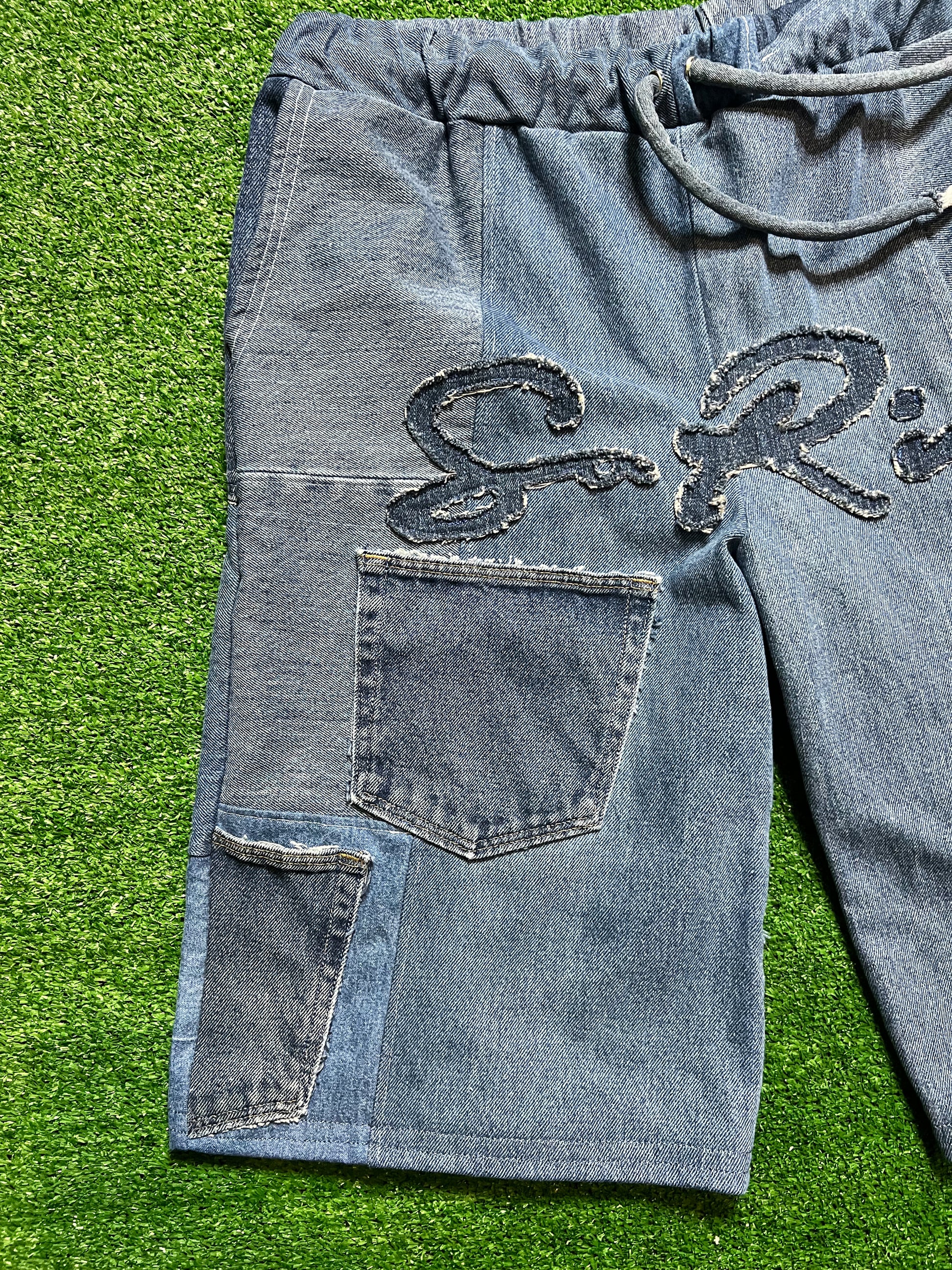 "Eyoni" Introduces A Pair of custom baggy jean shorts assembled out of upcycled high quality denim scraps w/elasticized waist, Denim/White rope drawstring, 5 Pocket Panel Set up & distressed "So Rich" Logo across the front.