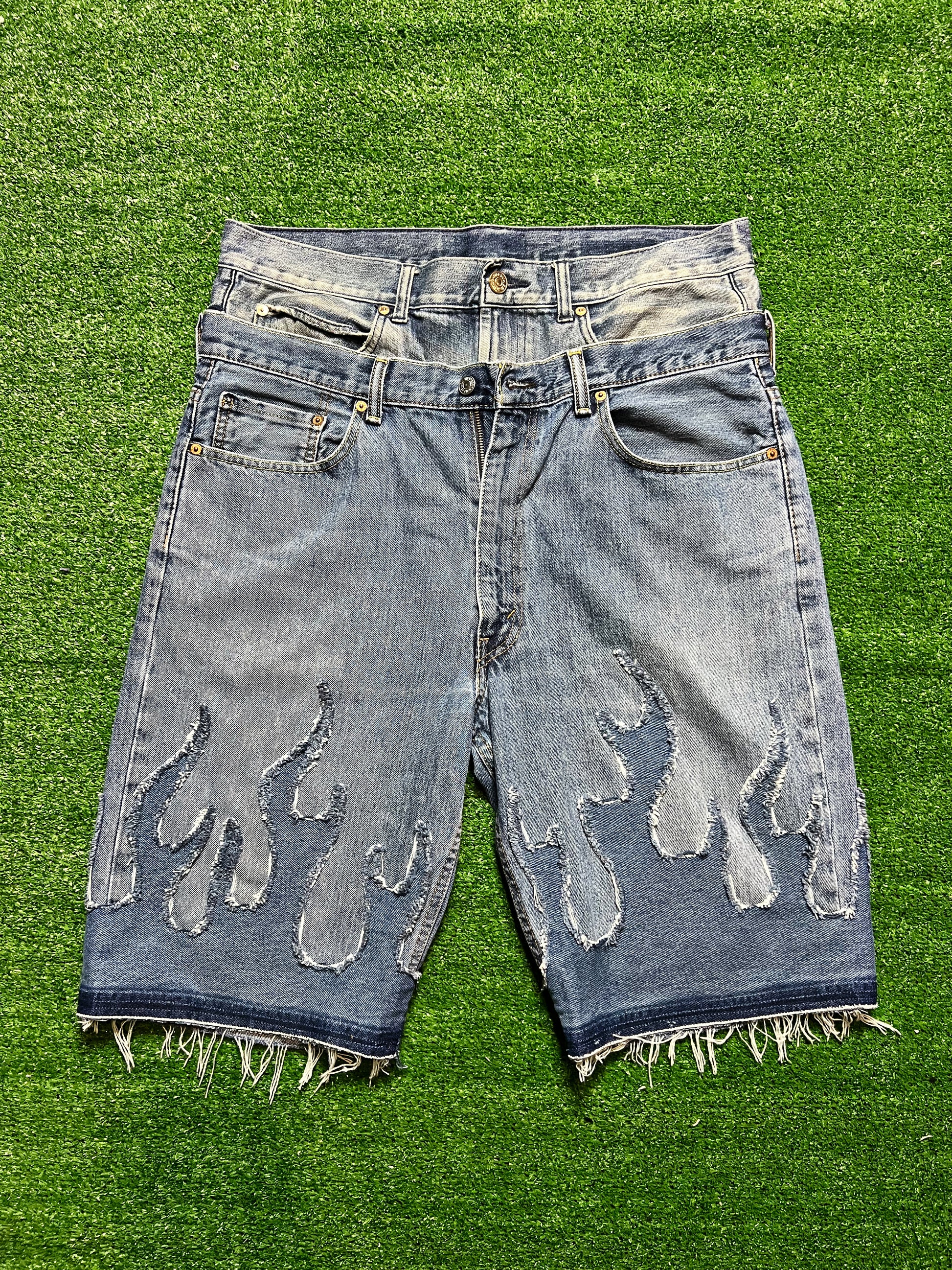 "Burnt Out" Introduces A Pair of custom baggy jean shorts assembled out of upcycled high quality denim pieces w/double waist along with belt loops, 5 Pocket Panel Set up & distressed flames that wrap around both legs.