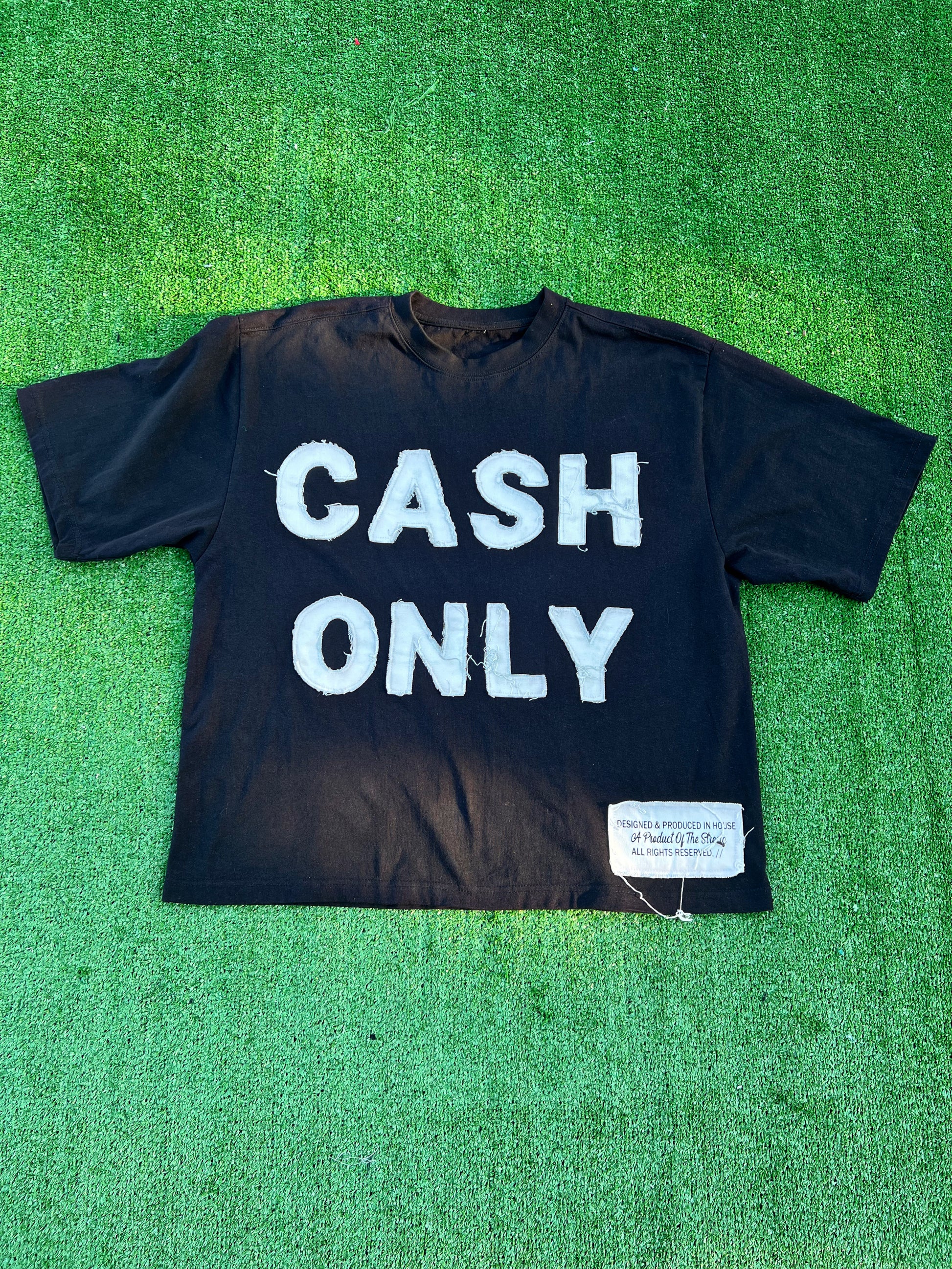 "CASH ONLY" Introduces A Black Heavyweight Oversized T-Shirt With a distressed Cotton logo "CASH ONLY", the epitome of comfort and style for those who prefer a relaxed and effortlessly cool look. Crafted with meticulous attention to detail, this t-shirt is designed to elevate your casual wardrobe to new heights.
