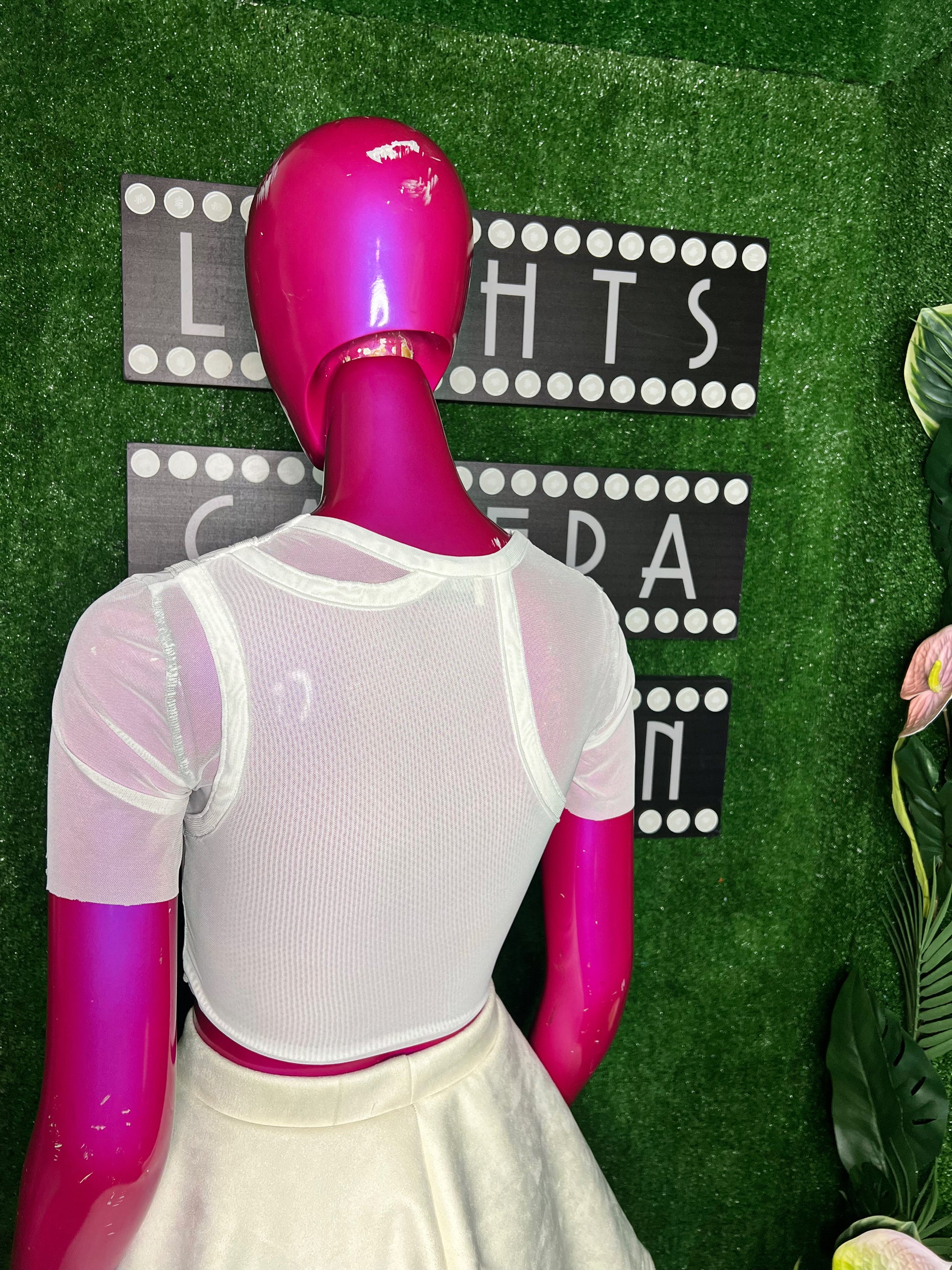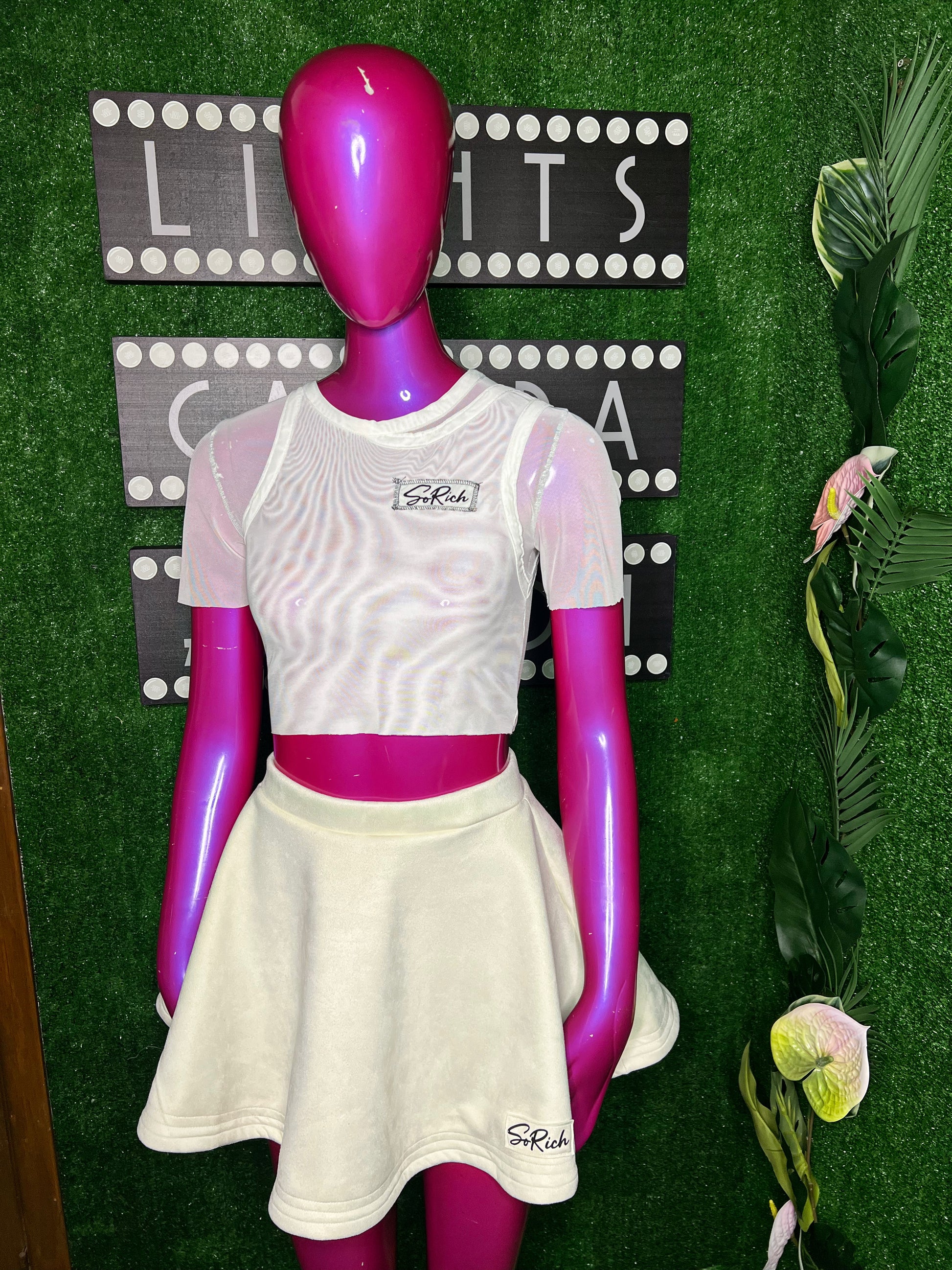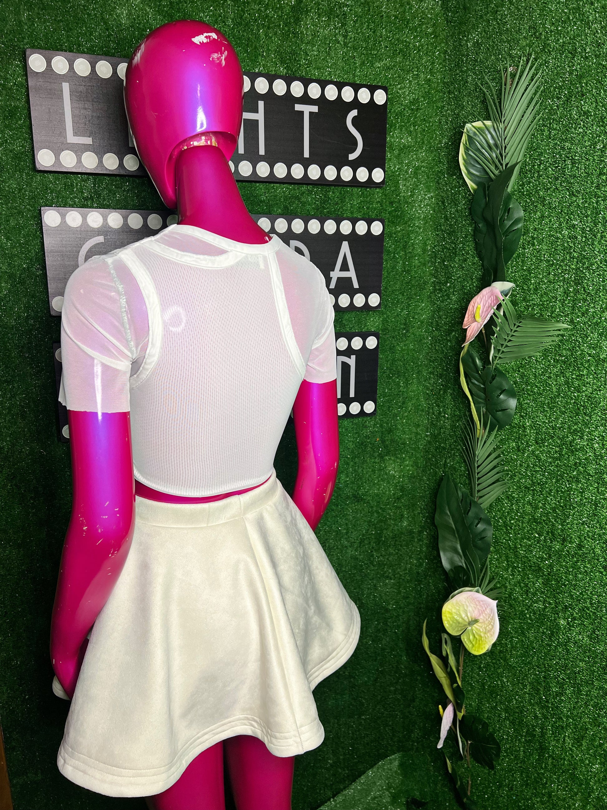 "CoCo" Set Introduces A White mesh stretch Knit layered top Featuring Long Extended Sleeves, High stretch & Logo Placement on the chest. Also A White woven Suede Knit mini circle skirt featuring an elasticized waistband, and Mesh Knit lining.