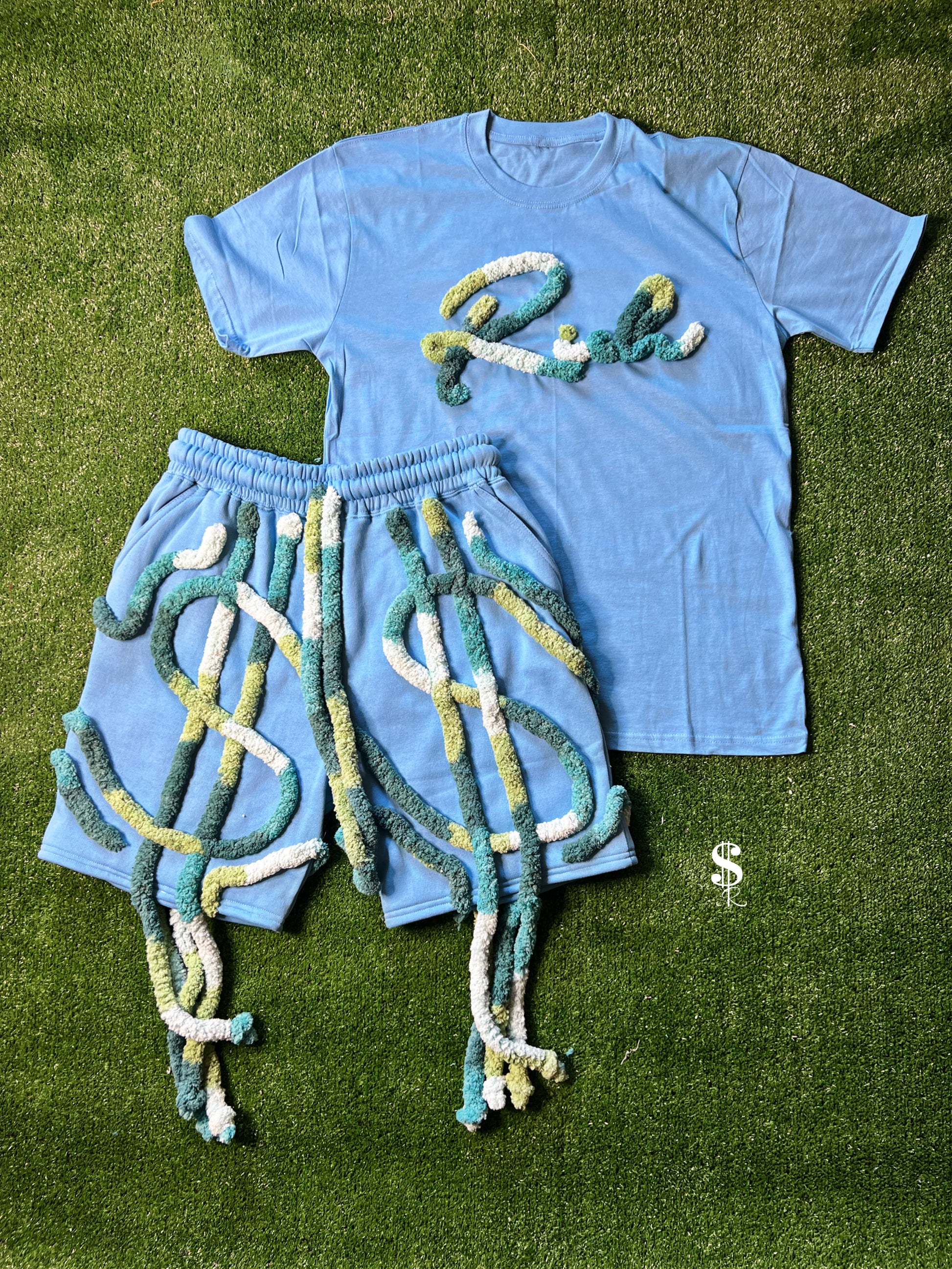 "R&R Shorts" Introduces A Blue Cotton Shirt featuring A Multi-color design with yarn And Short Dropped sleeves