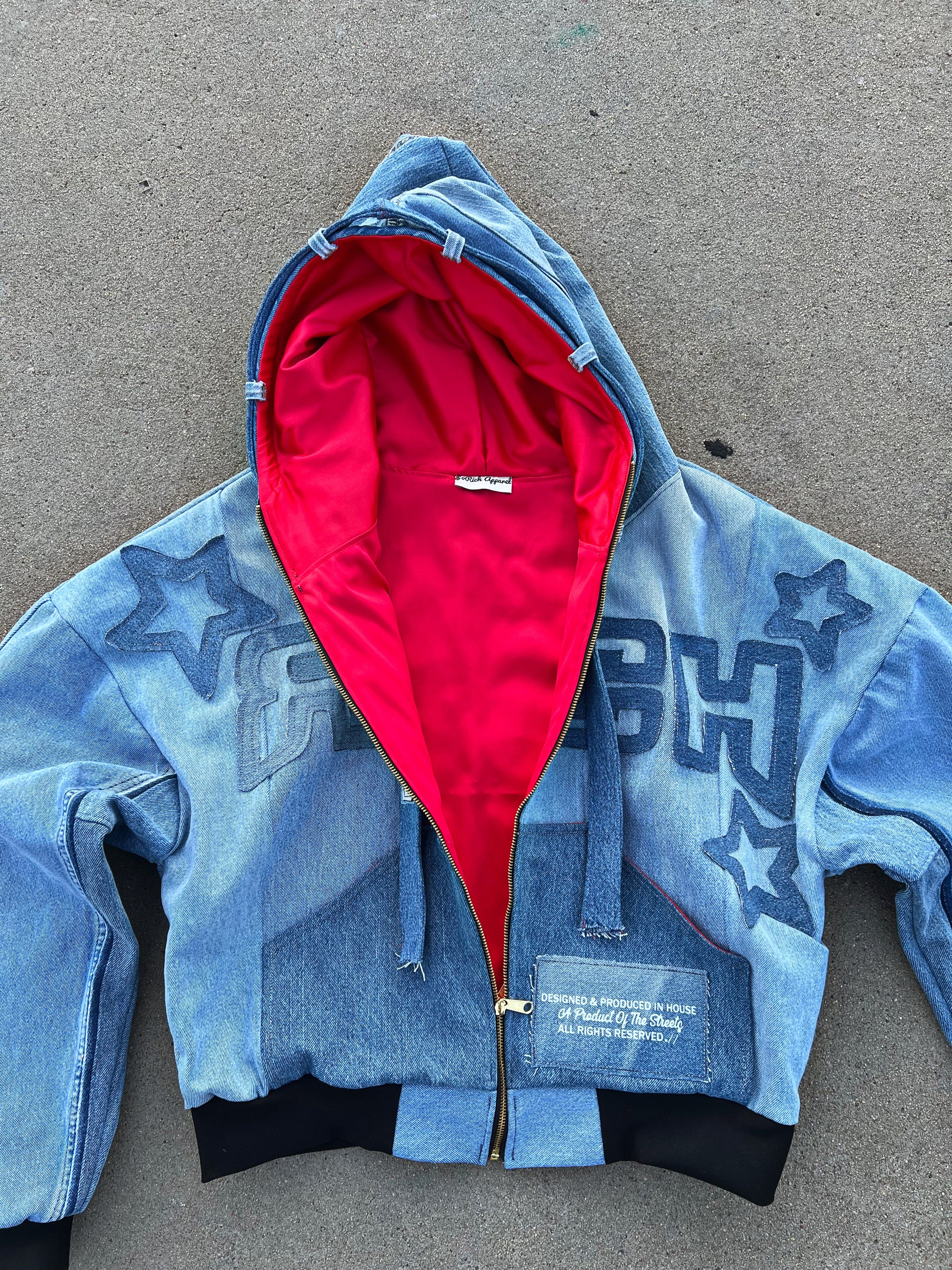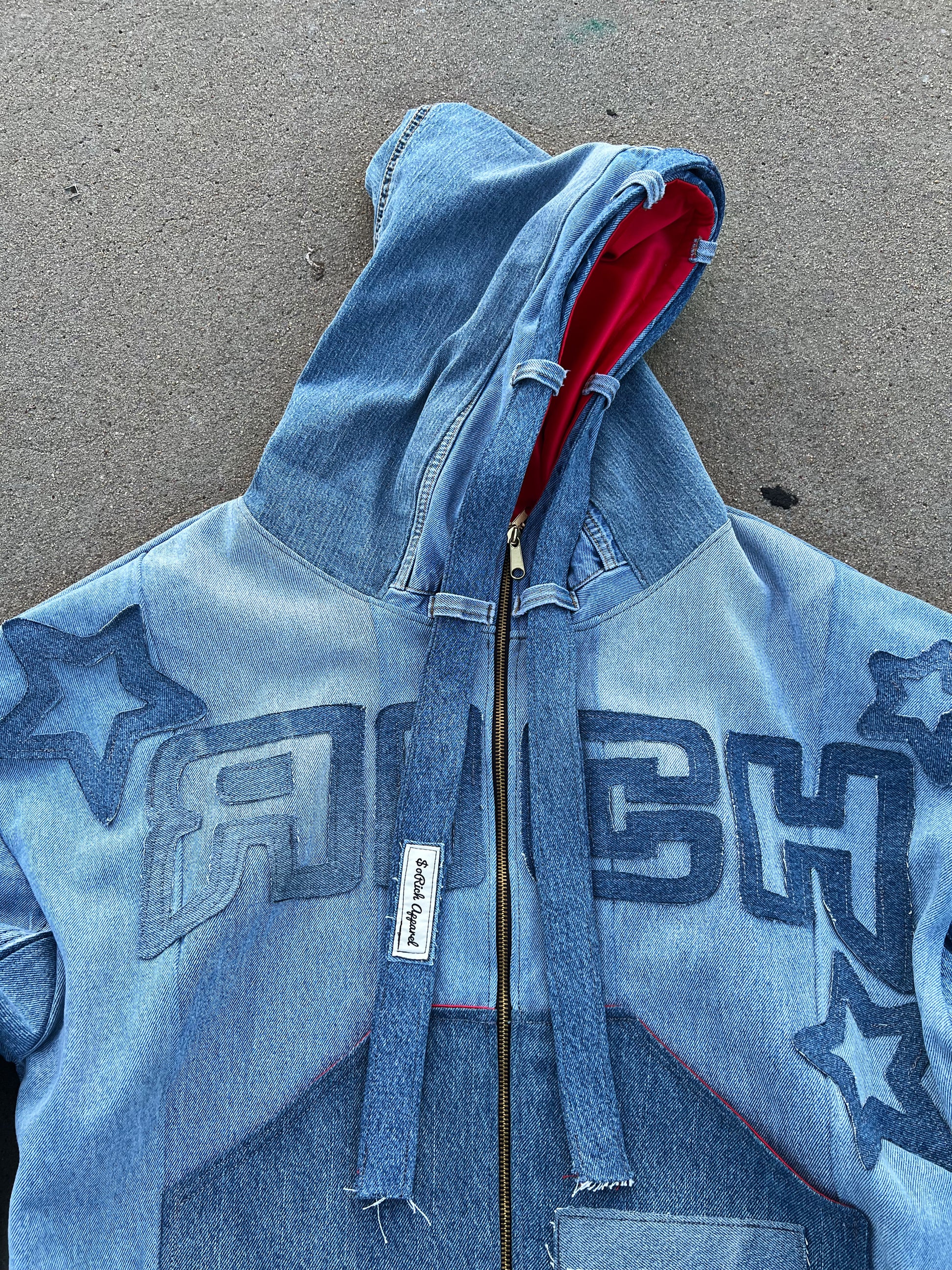 "STAR STRUCK" Introduces A Denim Heavyweight Oversized Zip-Up With a distressed Denim logo "RICH" W/Stars across the chest & Big Star Face On the Back, the epitome of comfort and style for those who prefer a relaxed and effortlessly cool look. Crafted with meticulous attention to detail, this Jacket is designed to elevate your casual wardrobe to new heights.