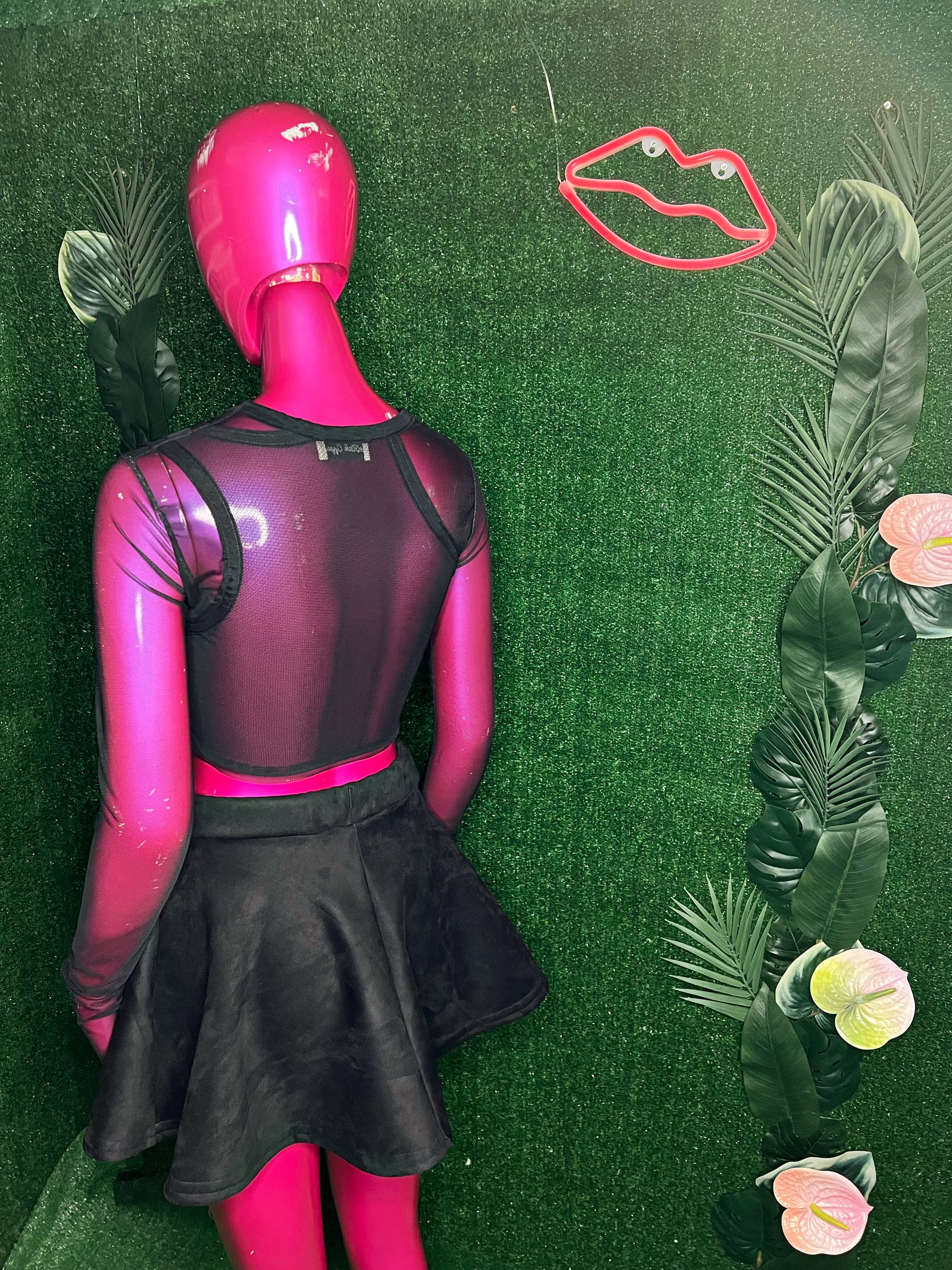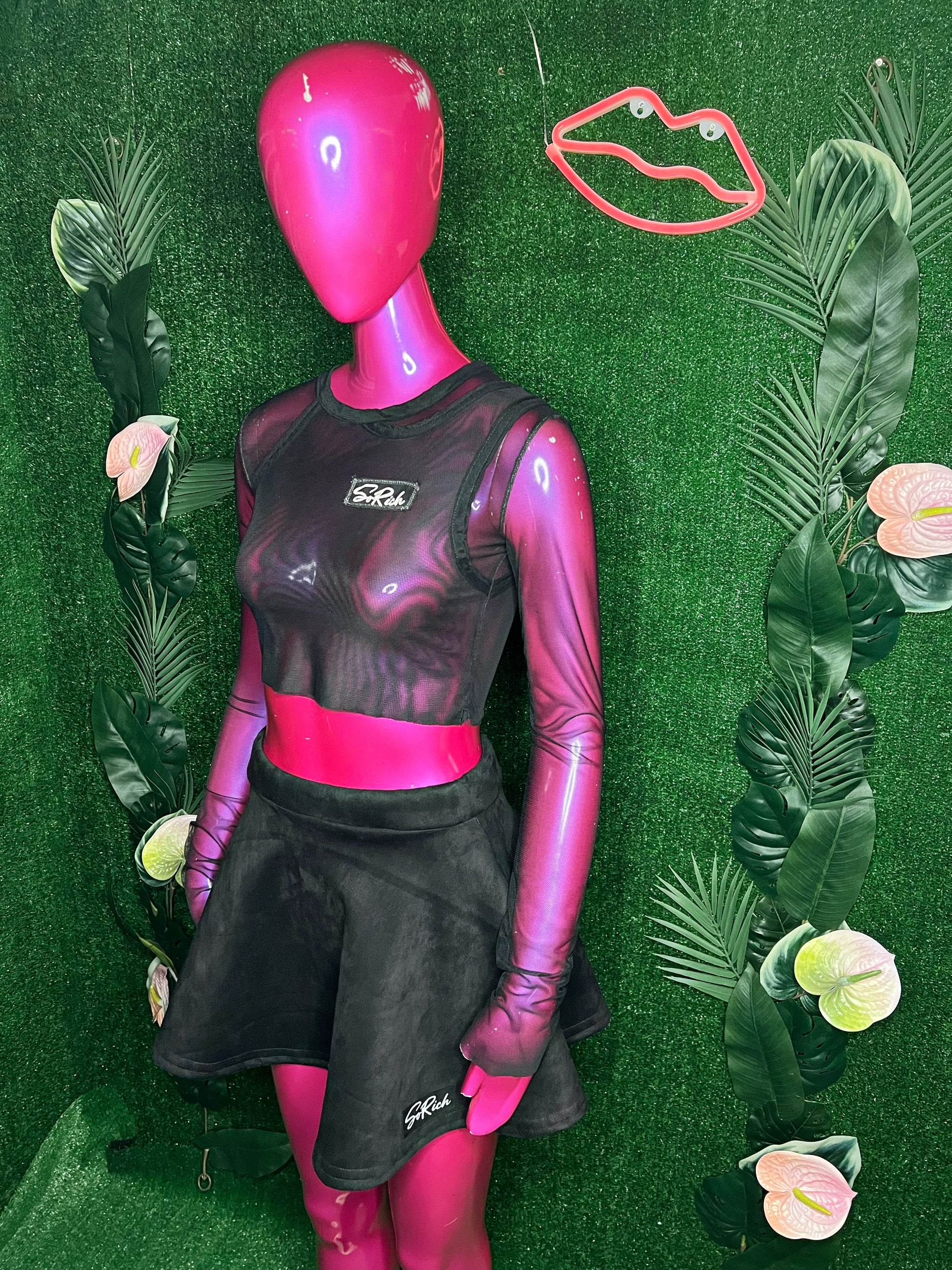 "Striker" Set Introduces A Black mesh stretch Knit layered top Featuring Long Extended Sleeves, High stretch & Logo Placement on the chest. Also A Black woven Suede Knit mini circle skirt featuring an elasticized waistband, and Mesh Knit lining.